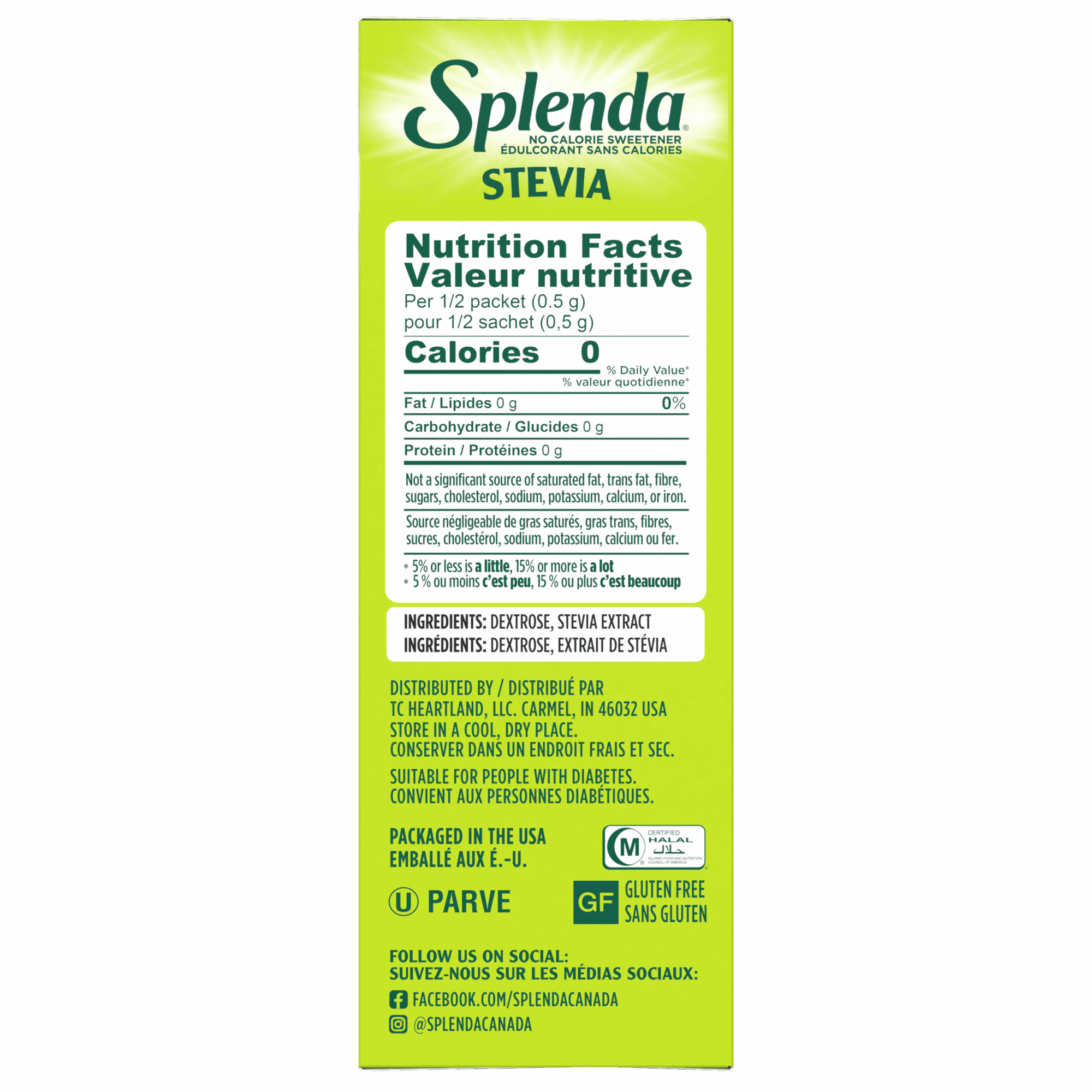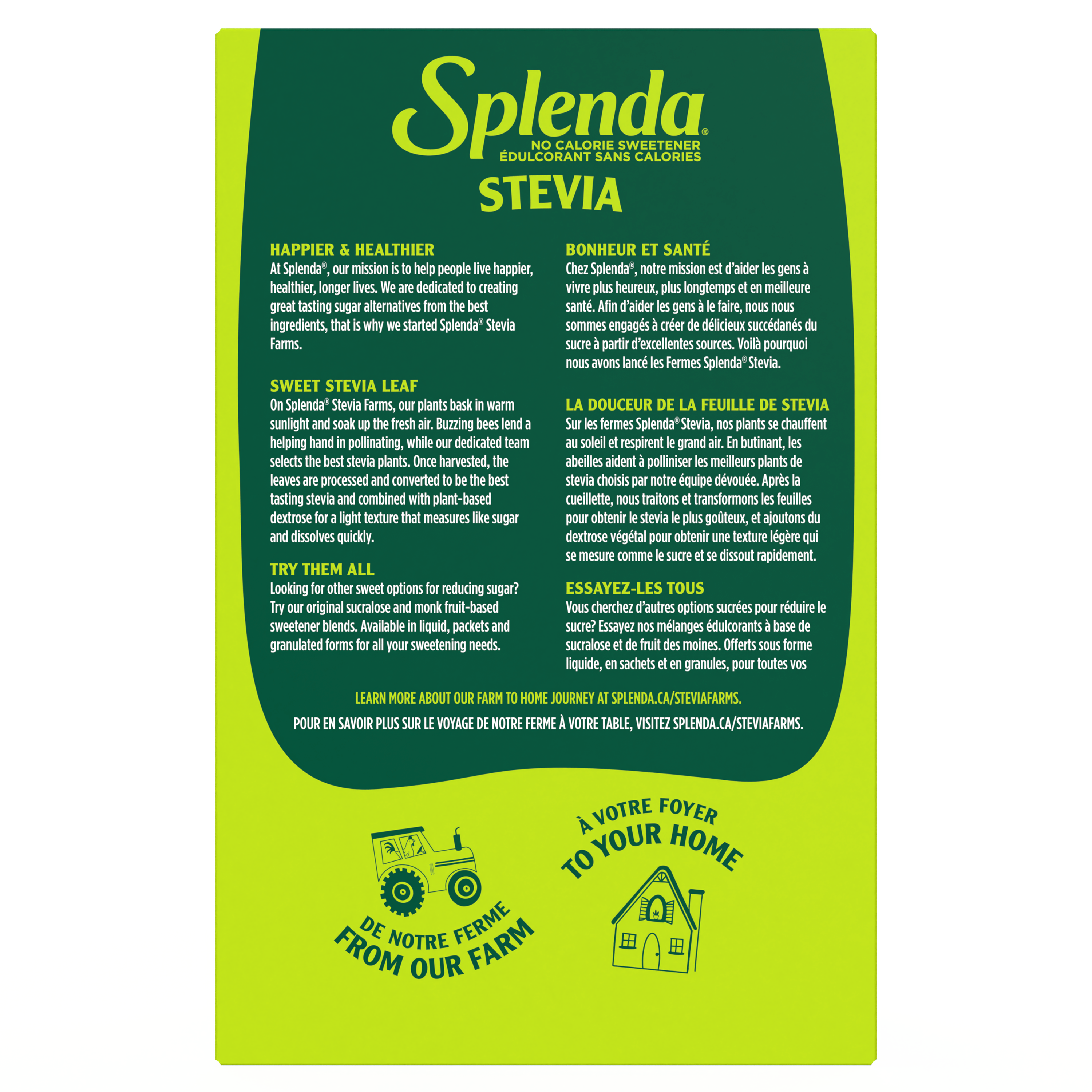 Nouveau de la marque d’édulcorant #1, une délicieuse stévia cultivée à la ferme. Les sachets d’édulcorant sans calories Splenda Stevia n’utilisent que la stévia la plus savoureuse, cultivée à Splenda Stevia Farms. Splenda Stevia est fabriqué avec des ingrédients simples, notamment de l’extrait de stévia et du dextrose, un ingrédient d’origine végétale. Nos plantes de stévia sont sélectionnées pour être délicieuses* afin que vous puissiez réduire le sucre ajouté dans tous vos aliments et boissons préférés. C’est la stévia que vous aimez de la marque d’édulcorant en laquelle vous avez confiance. Try it today!